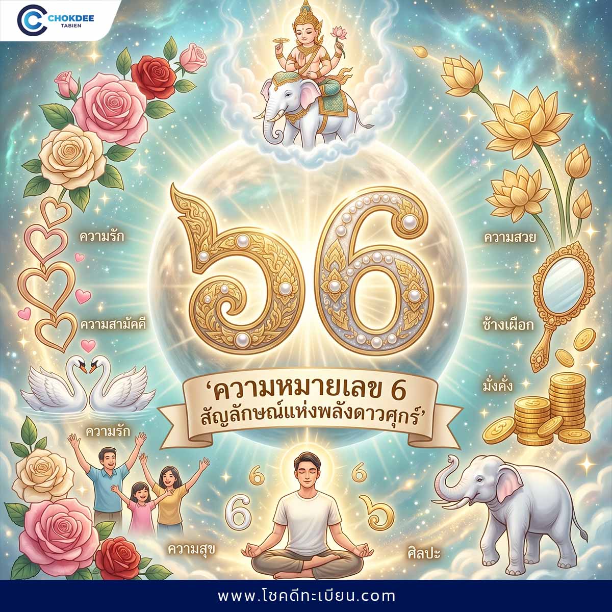 ในทางของศาสตร์ตัวเลข เลข 6 เป็นตัวแทนของดาวศุกร์ ซึ่งสื่อถึงความสุนทรีย์ ความมีศิลปะ และความอ่อนโยน คนที่เกี่ยวข้องกับพลังของเลขนี้มักจะมีเสน่ห์จากการพูดจาอ่อนหวาน มีความคิดสร้างสรรค์ และมีจินตนาการสูง จึงถือว่าเป็นเลขแห่งความรัก ความสุข และความสมดุลของชีวิต เพราะเลข 6 เกี่ยวข้องกับเรื่องของความรัก การเงิน ศิลปะ และดนตรี