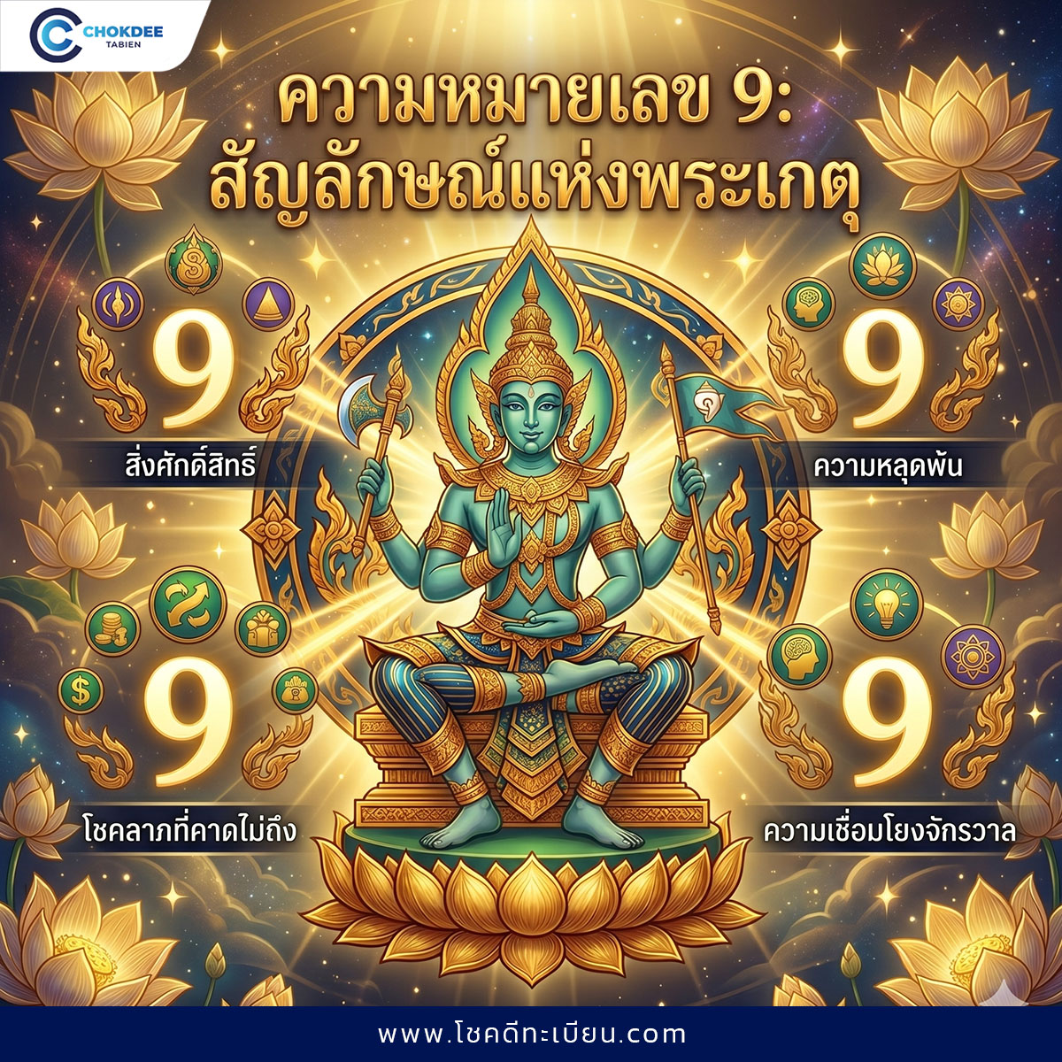 ในศาสตร์ตัวเลข 9 เป็นตัวแทนของพระเกตุ ซึ่งถือว่าเป็นดาวพิเศษที่มีพลังของธาตุทั้ง 4 ได้แก่ ดิน น้ำ ลม และไฟ จึงถูกมองว่าเป็นเลขที่มีพลังสูง และเป็นสัญลักษณ์ของ บารมี โชคลาภ และความสำเร็จ