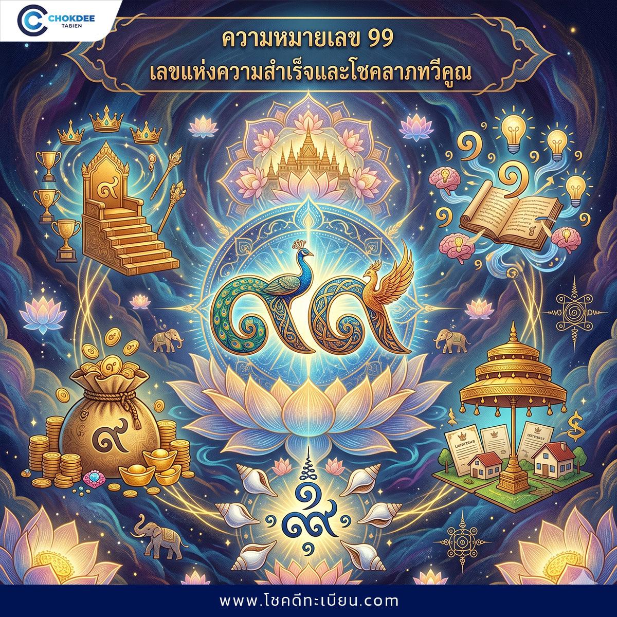 เลข 99 เป็นการรวมกันของเลข 9 สองตัว ซึ่งทำให้พลังของเลข 9 ทวีคูณยิ่งขึ้นไปอีก จึงสื่อถึงความสำเร็จ โชคลาภ ความเจริญรุ่งเรืองอย่างต่อเนื่อง และได้รับความคุ้มครองจากสิ่งศักดิ์สิทธิ์อีกด้วย